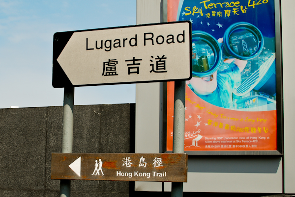 Atop the peak, hang around for just a minute. Take a few skyline photos. There’s some great street photography opportunities – grumpy tourists make such interesting subjects. Then, walk to the rear of the Peak Tower, the large modern building with the viewing platform. Off to your right, look for “Lugard Road”. I’ve put a photo of the sign post below. It’s barely a road, more a path. Head down that path.