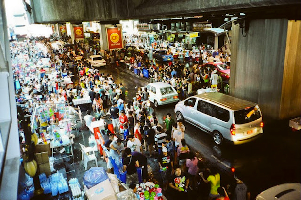 Several hours into the day, I found myself high above the road, on a platform of Sukhumvit train station. Below me, at street level, was absolute mayhem. After watching more than a few failed attempts at shooting me from below, I decided that I was high and dry enough to get some unique photos, in relative safety. Time to get the Leica out.